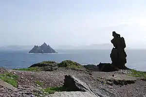 Skellig Michael (Irish: Sceilg Mhichíl [ˌʃcɛlʲɟ ˈvʲɪhiːlʲ]), also called Great Skellig (Irish: Sceilig Mhór [ˈʃcɛlʲɪɟ woːɾˠ]), is a twin-pinnacled crag 11.6 kilometres (7.2 mi) west of the Iveragh Peninsula in County Kerry, Ireland. The island is named after the archangel Michael, with "Skellig" derived from the Irish language word sceilig, meaning a splinter of stone. Its twin island, Little Skellig (Sceilig Bheag), is smaller and inaccessible (landing is not permitted). The two islands rose c. 374–360 million years ago during a period of mountain formation, along with the MacGillycuddy's Reeks mountain range. Later, they were separated from the mainland by rising water levels.