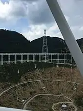 It has a novel design, using an active surface made of 4,500 metal panels which form a moving parabola shape in real time.[5] The cabin containing the feed antenna, suspended on cables above the dish, can move automatically by using winches to steer the instrument to receive signals from different directions. It observes at wavelengths of 10 cm to 4.3 m.[6][7]