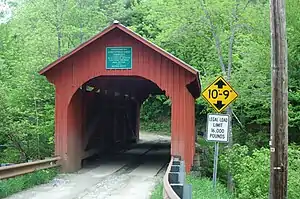 The bridge was built in 1872. It is one of five surviving 19th-century covered bridges in the town, representing one of the highest concentration of these historic structures in the state.[3] There are no documents to verify, but the 8-ton weight limit seems to indicate that the deck has been reinforced by I-beams, likely in the 20th century.[4]