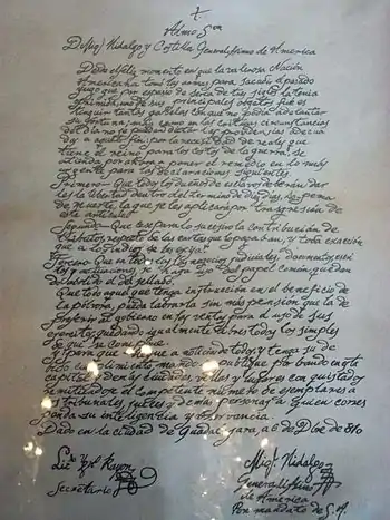 - ↑ "Mr. Hidalgo's side abolishing slavery; repealing the laws regarding taxes; imposing alcabala for national and foreign effects; prohibiting the use of sealed paper, and extinguishing the tobacco, gunpowder, colors and other tobacco shops". 500 años de México en documentos. Retrieved October 5, 2015.