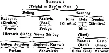 - On the right and left hand of Svetovid there are, respectively, Belobog ("White God") and Chernobog ("Black God"), themselves in the guise of Dazhbog ("Day God") and Jutrobog ("Moon God"). They are the supreme polarity upon which all the alternating ways of divine manifestation rely.