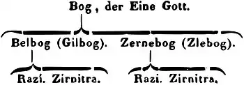 According to the Book of Veles, and to the doctrine accepted by many Rodnover organisations, the supreme Rod begets Prav (literally "Right" or "Order"; cf. Greek Orthotes, Sanskrit Ṛta) in primordial undeterminacy (chaos), giving rise to the circular pattern of Svarog ("Heaven", "Sky"; cf. Sanskrit Svarga), which constantly multiplies generating new worlds (world-eggs).[25] Prav is Rod itself manifesting as the universe.[46] Prav works by means of a dual dynamism, represented by Belobog ("White God"[14]) and Chernobog ("Black God"[14]);[25] described as the "second tier" in the cosmological hierarchy,[47] they are two aspects of "spontaneous division" of the same oneness of Rod, appearing in reality as elder white gods of creation and younger black gods of destruction,[32] the forces of waxing and waning, giving rise to polarities like up and down, bright and dark, masculine and feminine, singular and plural.[25] The younger black gods have always to act in accordance with stronger white gods, otherwise they generate evil.[32] The Belobog–Chernobog duality is also represented on the human plane as the Perun–Veles duality, where the former is the principle of martiality and the latter is the principle of mystical philosophy.[48] Man and woman are further symbolised by father Svarog itself and mother Lada.[25]