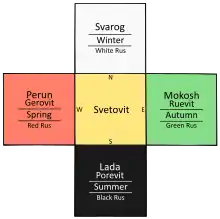 Svetovid ("Worldseer", or more accurately "Lord of Power" or "Lord of Holiness", the root *svet defining the "miraculous and beneficial power", or holy power)[62] is the four-faced god of war and light, and "the most complete reflection of the Slavic cosmological conception", the union of the four horizontal directions of space with the three vertical tiers of the cosmos (Heaven, Earth and the underworld), and with the three times.[60] Helmold defined Svetovid as deus deorum ("god of all gods");[63] Dynda further defines Svetovid, by Jungian words, as a "fourfold (quaternitas) potentiality which comes true in threefoldness (triplicitas)".[60] His four faces are the masculine Svarog ("Heaven", associated to the north direction and the colour white) and Perun ("Thunder", the west and red), and the feminine Mokosh ("Wetness", the east and green) and Lada ("Beauty", the south and black). The four directions and colours also represent the four Slavic lands of original sacred topography.[note 2] They also represent the spinning of the four seasons.[64]