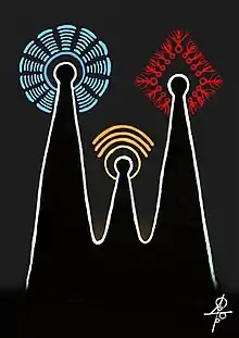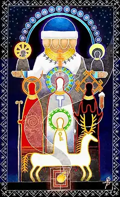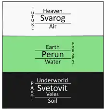 According to Shnirelman, this triune vision and associations were codified by Yury P. Mirolyubov and further elaborated by Valery Yemelyanov, both interpreters of the Book of Veles.[51] In olden times, already Ebbo documented that the Triglav was seen as embodying the connection and mediation between Heaven, Earth and the underworld.[53] Adam of Bremen described the Triglav of Wolin as Neptunus triplicis naturae (that is to say "Neptune of the three natures/generations") attesting the colours that were associated to the three worlds, then further studied by Karel Jaromír Erben: white for Heaven, green for Earth and black for the underworld.[54] Other names of the two manifestations of Svarog are Dazhbog ("Giving God", "Day God") and Svarozhich (the god of fire, literally meaning "Son of Heaven").[14] According to the studies of Jiří Dynda, the three faces of Triglav are rather Perun in the heavenly plane (instead of Svarog), Svetovid in the centre from which the horizontal four directions unfold, and Veles in the underworld.[55] The netherworld, especially in its dark aspect, is indeed traditionally embodied by Veles, who in this function is the god of waters but also the one who guides athwart them in the function of psychopomp (cf. Sanskrit Varuna).[56] Veles is the master of the material world, who magically creates, destroys and synthesises all contradictory tendences; he is associated with the forests and with animals, chiefly the bear, the wolf and the cattle — the Slavic priests themselves, known as volkhvs (a derivative of volk, "wolf"), are his impersonators.[57]