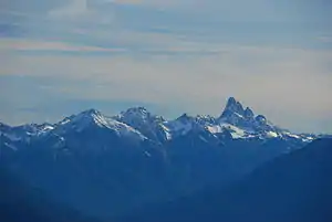 Slesse Mountain, usually referred to as Mount Slesse, is a mountain just north of the US-Canada border, in the Cascade Mountains of British Columbia, near the town of Chilliwack. It is notable for its large, steep local relief. For example, its west face drops over 1,950 m (6,398 ft) to Slesse Creek in less than 3 km (2 mi). It is also famous for its huge Northeast Buttress; see the climbing notes below. The name means "fang" in the Halkomelem language.[2] Notable nearby mountains include Mount Rexford and Canadian Border Peak in British Columbia, and American Border Peak, Mount Shuksan, and Mount Baker, all in the US state of Washington.[1]