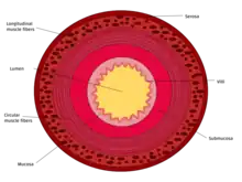 This cross section diagram shows the 4 layers of the small intestine wall.