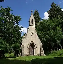 Thomas Fuller (1823–1898) was employed as the architect with George Mann as the builder of the Anglican Mortuary Chapel. It was Grade II listed 2008.[3][4] The corner stone of the Chapel was laid on 9 May 1855 and the consecrated ground opened for burials in 1856. The consecration of the land by the Bishop of Bath and Wells took place on 15 Feb 1856 and this was reported in the Bath & Cheltenham Gazette of 20 February 1856.[5] In 1907 the original St Mary the Virgin Churchyard was extended by a further six sections.