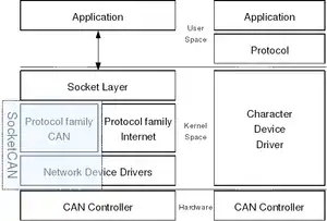The SocketCAN concept extends the Berkeley sockets API in Linux by introducing a new protocol family, PF_CAN, that coexists with other protocol families, such as PF_INET for the Internet Protocol. The communication with the CAN bus is therefore done analogously to the use of the Internet Protocol via sockets. Fundamental components of SocketCAN are the network device drivers for different CAN controllers and the implementation of the CAN protocol family. The protocol family, PF_CAN, provides the structures to enable different protocols on the bus: Raw sockets for direct CAN communication and transport protocols for point-to-point connections. Moreover the broadcast manager which is part of the CAN protocol family provides functions e.g. for sending CAN messages periodically or realize complex message filters. Since Linux kernel Version 5.10 the protocol family also includes an ISO-TP implementation, CAN_ISOTP.[1]