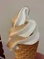 A mixture of chocolate and vanilla soft serve being dispensed, a flavor colloquially referred to as swirl or twist