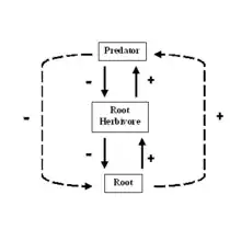 An interaction web, shown above right,[9] is similar to a topological web, but instead of showing the movement of energy or materials, the arrows show how one group influences another. In interaction food web models, every link has two direct effects, one of the resource on the consumer and one of the consumer on the resource.[10] The effect of the resource on the consumer is positive, (the consumer gets to eat) and the effect on the resource by the consumer is negative (it is eaten). These direct, trophic, effects can lead to indirect effects. Indirect effects, represented by dashed lines, show the effect of one element on another to which it is not directly linked.[10] For example, in the simple interaction web below, when the predator eats the root herbivore, the plant eaten by the herbivore may increase in biomass. We would then say that the predator has a beneficial indirect effect on the plant roots.