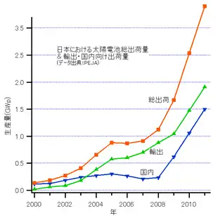 Solar power in Japan has been expanding since the late 1990s. The country is a major manufacturer and exporter of photovoltaics (PV) and a large installer of domestic PV systems, with most of them grid connected.[1]