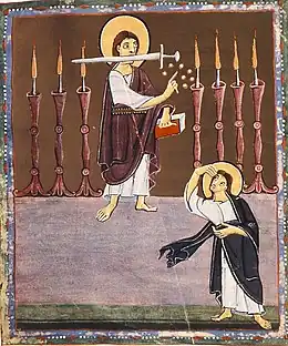 "One like a son of man" with a sword among the seven lampstands, in John's vision. From the Bamberg Apocalypse, 11th century.