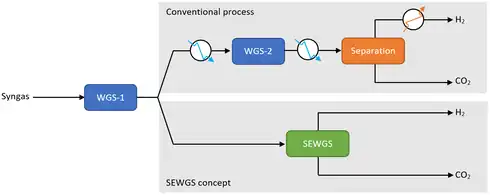 The SEWGS technology is the combination of the water gas shift reaction with the adsorption of carbon dioxide on a solid material. Typical temperature and pressure ranges are 350-550 °C and 20-30 bar. The inlet gas of SEWGS reactors is typically a mixture of hydrogen, CO and CO2, where steam is added to convert CO into CO2.[4]