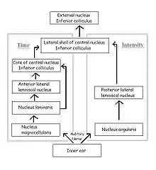 In the time pathway, the nucleus laminaris (mammalian medial superior olive) is the first site of binaural convergence. It is here that ITD is detected and encoded using neuronal delay lines and coincidence detection, as in the Jeffress model; when phase-locked impulses coming from the left and right ears coincide at a laminaris neuron, the cell fires most strongly. Thus, the nucleus laminaris acts as a delay-line coincidence detector, converting distance traveled to time delay and generating a map of interaural time difference. Neurons from the nucleus laminaris project to the core of the central nucleus of the inferior colliculus and to the anterior lateral lemniscal nucleus.