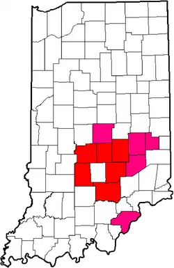 The South Central Conference in Indiana. Counties in red contained schools at the time of disbanding, counties in pink contained former member schools who left before conference folded.