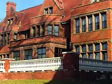 At an annual meeting in 1895, Library Trustees considered the question of obtaining a library building and Eugene V. Connett's offer of a library site on the corner of Scotland Road and Taylor Place, once a $7,500 subscription was met (equivalent to $73,000 in 2022). On May 8, 1896, the library was moved into the building on that corner. A referendum held on April 27, 1926, showed that citizens had voted ten to one in favor of the town taking over full support of the library. It thereupon became "The South Orange Public Library." In February 1929, the Village Trustees passed an ordinance providing funds to construct a rear wing on the library and to provide a Children's Room in the basement, book stacks and a balcony on the floor above, together with rehabilitation work on the older part of the building. In November 1968, the new library building on the corner of Scotland Road and Comstock Place was dedicated.[41]