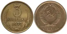 In 1935, the reverse of the 10, 15, and 20 kopeck coins were redesigned again with a simpler Art Deco inspired design, with the obverse of all denominations also redesigned, having the "Workers of the world, unite!" slogan dropped. The change of the obverse designs did not affect all 1 kop, 2 kop, 3 kop, and 5 kop coins immediately, as some 1935 issues bore the "Workers of the World" design while some bore the new "CCCP" design. The state emblem also went through a series of changes between 1935 and 1957 as new soviet republics were added or created, this can be noted by the number of "ribbons" wrapped around the wheat sheaves. This coin series remained in circulation during and after the monetary reform of 1947 and was finally discontinued in 1961.