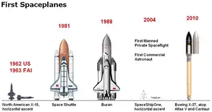 The Space Shuttle orbiter ranks second among the world's first spaceplanes, preceded only by the North American X-15 and followed by the Buran, SpaceShipOne, and the Boeing X-37.