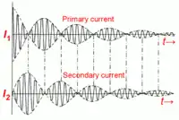 The inductively-coupled transmitter had a more complicated output waveform than the non-syntonic transmitter, due to the interaction of the two resonant circuits. The two magnetically coupled tuned circuits acted as a coupled oscillator, producing beats (see top graphs). The oscillating radio frequency energy was passed rapidly back and forth between the primary and secondary resonant circuits as long as the spark continued.[84][79][85] Each time the energy returned to the primary, some was lost as heat in the spark.[85][79] In addition, unless the coupling was very loose the oscillations caused the transmitter to transmit on two separate frequencies.[79][86] Since the narrow passband of the receiver's resonant circuit could only be tuned to one of these frequencies, the power radiated at the other frequency was wasted.