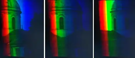 A prototypical spatio-spectral scanning system, introduced in June 2014, consists of a basic slit spectroscope (slit + dispersive element) at some suitable, non-zero distance before a camera. (If the effective camera distance is zero, the system is applicable to spatial scanning). The imaging process is based on spectrally-decoded camera obscura projections: A series of projections from a continuous array of pinholes (= the slit) is projected onto the dispersive element, each projection contributing a rainbow-colored strip to the recorded two-dimensional image. The field of view in the wavelength-coded spatial dimension asymptotically approaches the dispersion angle of the dispersive element as the camera distance from the dispersive element approaches infinity.[1] Scanning is achieved by moving the camera transverse to the slit (stationary platform), or by moving the entire system transverse to the slit (mobile platform).