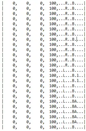 Example tool-assisted speedrun input file, showing which buttons will be pressed at which point in the sequence