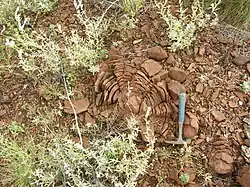 Spheroidal weathering is a form of chemical weathering that affects jointed bedrock and results in the formation of concentric or spherical layers of highly decayed rock within weathered bedrock that is known as saprolite. When saprolite is exposed by physical erosion, these concentric layers peel (spall) off as concentric shells much like the layers of a peeled onion. Within saprolite, spheroidal weathering often creates rounded boulders, known as corestones or woolsack, of relatively unweathered rock. Spheroidal weathering is also called onion skin weathering, concentric weathering, spherical weathering, or woolsack weathering.[1][2][3][4]