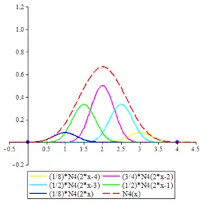The cardinal B-splines are defined recursively starting from the B-spline of order 1, namely , which takes the value 1 in the interval [0, 1) and 0 elsewhere. Computer algebra systems may have to be employed to obtain concrete expressions for higher order cardinal B-splines. The concrete expressions for cardinal B-splines of all orders up to 6 are given below. The graphs of cardinal B-splines of orders up to 4 are also exhibited. In the images, the graphs of the terms contributing to the corresponding two-scale relations are also shown. The two dots in each image indicate the extremities of the interval supporting the B-spline.