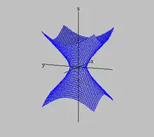 This stratification can be refined by considering split-quaternions of a fixed norm: for every real number n ≠ 0 the purely nonreal split-quaternions of norm n form an hyperboloid. All these hyperboloids are asymptote to the above cone, and none of these surfaces intersect any other. As the set of the purely nonreal split-quaternions is the disjoint union of these surfaces, this provides the desired stratification.