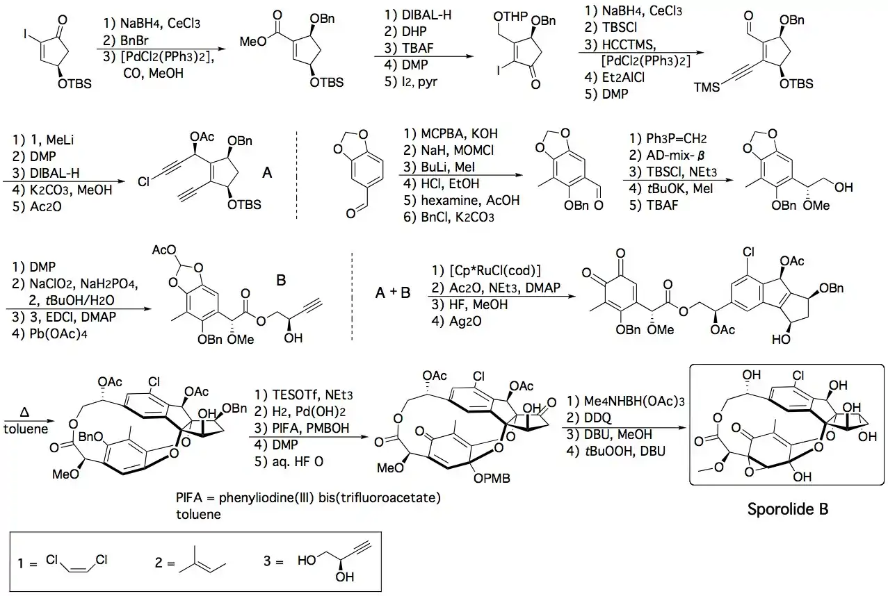 The first total synthesis of sporolide B was reported by K. C. Nicolaou's group and used a highly stereoselective and convergent strategy that involved two cycloaddition reactions. The first was a ruthenium-catalyzed intermolecular [2+2+2] cycloaddition reaction between two acetylenic units, A and B, and the second a thermally induced intramolecular [4+2] cycloaddition reaction between an o-quinone and the tetrasubstituted olefin within the intermediate, forming the macrocyclic structure of the target product.[5][6]