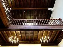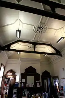 Two original first-floor fireplaces survive. One of these has an over-painted stone surround and mantelpiece, and a hearth surfaced with Arts and Crafts tiles.[27] The other one in the music room is a large and decoratively carved oak affair, with matching doorways either side. These doors open into a dressing room, allowing the fireplace to be a backdrop for performances.[28] The doors and fireplace contain half-columns and pediments in a semi-neoclassical style, with a carved frieze of fruit and leaves, and the helmeted head of St Cecilia, patroness of musicians.[29] The hearth contains a hand-made Arts and Crafts cast iron hood and moulded, coloured ceramic tiles on the surround. The hearth's floor tiles have been removed. The music room has a carved, oak dado, and a decorative plaster ceiling with ceiling roses which double as ventilators, and there are the original wooden beams designed to support the heavy hung ceiling.[28][30]