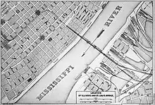 The designer of the Eads Bridge, James B. Eads, worked out the specifications for the tunnel.[1] It would be a cut-and-cover tunnel 4,880 feet (1,490 m) long and 30 feet (9.1 m) below street level. A smokestack with a fan that pulled exhaust from the tunnel was built near St. Charles Street (it has since been demolished).[2] Several problems arose during construction of the bridge and tunnel including design changes, inflated land and labor costs, and renegotiated contracts that escalated construction costs 46% over initial estimates. The tunnel structure was completed by June 24, 1874, and the bridge would open less than a month later on July 4.[3]