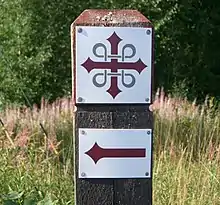 Today St. Olavsleden stretches 564 km from the Bothnian sea in the east to the Atlantic Ocean in the west through two countries and eleven municipalities.[2] The trail is marked with the St. Olav symbol, which marks all the so-called St. Olav roads (Sw.: S:t Olavsvägar), leading towards Nidaros Cathedral. St. Olavsleden passes through the ancient cultural landscape, following as closely as possible the roads and paths that pilgrims of that time and other travelers wandered and rode. The first hundred kilometers the trail mostly follows Ljungan river, and in Jämtland the trail goes along the lakes Revsundssjön and Storsjön, and eventually Indalsälven river. St. Olavsleden crosses the Scandinavian mountains on the border between Sweden and Norway along Swedish county road 322 (Skalstuguvägen) and in Norway goes through the agricultural landscape near the Trondheim fjord. St. Olavsleden is moderately hilly which makes it suitable for cycling.[3]