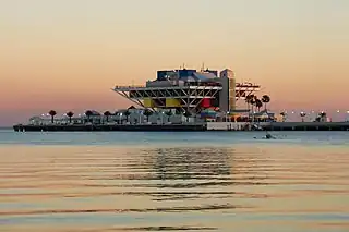 The St. Petersburg Pier, officially known as the St. Pete Pier, is a landmark pleasure pier extending into Tampa Bay from downtown St. Petersburg, Florida, United States. Over the years several different structures have been built at the same location. The most recent structure, the third owned by the city, was a five-story inverted pyramid-shaped building,[1][2] designed by St. Petersburg architect William B. Harvard, Sr.[3] That Inverted Pyramid Pier was closed in 2013, and the new 26-acre Pier District opened on July 6, 2020.[4] The $92 million dollar project includes five restaurants,[5] a playground, an environmental education center, and numerous artworks including work by Xenobia Bailey, Nathan Mabry, Nick Ervinck,[6] and a large sculpture entitled Bending Arc by Janet Echelman.[7] Its opening was scheduled for May 30, 2020,[8] but was postponed due to the COVID-19 pandemic in Florida.