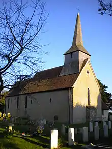 Originally built of timber, the Saxon church was replaced in the 12th century by a stone and timber building with windows on the north and south sides. The bell turret is carried on a timber frame inside the nave. The chancel and chancel arch date from the 13th century, the arch having scalloped imposts similar to Oving church. A crude and badly weathered Saxon fragment, which may represent a beheading, forms the top of one of the Norman nave windows. There is a plain tub font.[3] The size of the yew tree by the present door suggests an ancient sacred site.[4]