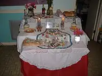 One prominent custom is the Saint Joseph's day altar, which has spread from Sicily to the United States in the 1800s. These altars are typically elaborate; being decorated with figurines, medals, and votive candles. The Saint Joseph's day altar is into three sections representing the three persons of the Trinity, and has a statue of Joseph at its head. The tables are dressed with food, which are donated to the poor on the solemnity.[13] Upon a typical Saint Joseph's Day altar, people place flowers, limes, candles, wine, fava beans, specially prepared cakes, breads, and cookies (as well as other meatless dishes), and zeppole. Foods are traditionally served containing bread crumbs to represent saw dust since Joseph was a carpenter. Because the feast occurs during Lent, traditionally no meat was allowed on the celebration table. The altar usually has three tiers, to represent the Trinity.[14]