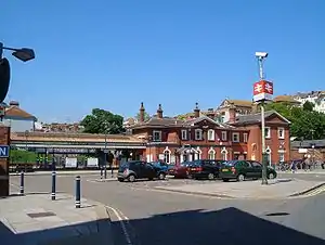 The station building and house, still in existence today, were constructed in 1851 by the South Eastern Railway (SER). The competing London, Brighton and South Coast Railway (LBSCR) trains were not allowed to stop here until December 1870.[2] Between 1851 and 1882, it was named Gensing Station. The two companies maintained separate booking offices until 1923 when they both became part of the Southern Railway. The station is constructed in a narrow valley with higher ground east and west, so that trains arrive and depart either end of the platform through tunnels. This restricts the number of carriages which have direct access to the platform to 8 cars.