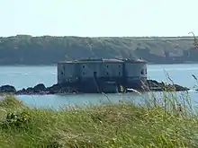 A fortification at Stack Rock was first proposed by Thomas Cromwell in 1539 to protect the waterway, although this would not actually come to fruition at the time. Similar proposals were made in 1748 when Lewis Morris carried out a survey of Milford Haven, reporting on shipwrecks and navigation and recommending that a small fort be built here. Another survey followed in 1817. The Royal Dockyard at Pembroke Dock was felt to be in need of defence from the sea,[2] The result was a tower mounting three guns, similar to the two towers in Pembroke Dock.[3] The tower was oval in section, with a maximum diameter of 55 feet (17 m) and a maximum height of 30 feet (9.1 m).[4] Construction commenced in 1850, being completed in 1852.[5]
