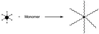 In the core-first approach (also known as the "arm-out" or divergent approach[1]), a multifunctional core serves as the initiator simultaneously for several arms. This approach proves to be more complicated than the arm-first approach, in that finding an appropriate and stable core is difficult, and characterizing the synthesized star-polymer is challenging.[16]