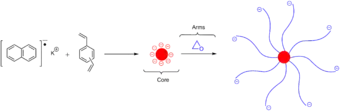 The core-first route was first approached in 1988 through functionalizing DVB using potassium naphthalenide to create a multifunctional core.[17] The core can than be reacted with ethylene oxide to create a star-shaped polymer. As is typical of most core-first approaches, this scheme had issues with high viscosity and gelation. The star-shaped polymer was characterized by size-exclusion chromatography and light scattering techniques.