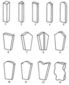 Standing stećaks are mostly cut in the form of columns. This form is very similar to the oldest Muslim nišans without turbans, on which appearance stećaks in the form of columns had a certain influence.[6] Columns are nothing more than upright slabs or upright chests. In order for them to stand firmly, they had to be partially buried or dug in, or in local tongue "usaditi" (transl. "planted" – transl. "rooted"), into the ground which is why they are most often called "usađenik". Thus, some columns end with a flat top surface, some as a roof with two or three sides. There are columns that end in a protruding, rounded, barrel-shaped way, as well as those that are arched in that part, lying down. Quite a number of upright slabs are carved so that they gradually widen from the bottom upwards. And such surfaces have very different finishes. Quite rare examples of columns that look like upright gables have also been found. Amorphous or loosely carved upright stećaks similar to columns have been recorded. The number of columns is about 4% of the total stećak. The fact that the columns are mostly studded in Serbia and eastern Bosnia, and that there are few of them in central Bosnia, and that in western Bosnia, Herzegovina, Montenegro and Croatia they are a very rare or almost completely exceptional phenomenon, clearly shows where this influence, due to the Turkish-Ottoman presence, first reflected. Stećci columns are considered to be a phenomenon of the second half of the 15th and the entire 16th century.