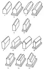 Gable-shaped or sarcophagus stećak is a chest where the upper side is no longer horizontal but resembles a gabled house-roof. The name sarcophagus is also because at first glance it is similar to the Roman sarcophagus. Sometimes the top surfaces of the gables are slightly protruding, and sometimes slightly hollowed out. The top is sometimes high and steep, and sometimes low. There are several varieties of gable stećaks with four different varieties of top surfaces. In a significant number of examples, the top surface somewhat exceeds the vertical surfaces of the monument, so that viewer experience a top with eaves and gutters. The size of the gables is very different, especially their height. In Herzegovina they are very high, while in central and northeastern Bosnia, in Podrinje, for its low ridges. As with chests, many gables are beveled towards the bottom. Also, with this form of stećak, there are doubles. Several examples of doubles were also found consisting of two equal joined – homogeneous – gables. Gable-shaped stećak can be said to be more carefully and more elaborately carved than the others. It makes about 9% of the total number of stećaks in general.[5]