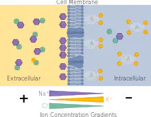 One main function of plasma and cell membranes is to maintain asymmetric concentrations of inorganic ions in order to maintain an ionic steady state different from electrochemical equilibrium.[8] In other words, there is a differential distribution of ions on either side of the cell membrane - that is, the amount of ions on either side is not equal and therefore a charge separation exists.[8] However, ions move across the cell membrane such that a constant resting membrane potential is achieved; this is ionic steady state.[8] In the pump-leak model of cellular ion homeostasis, energy is utilized to actively transport ions against their electrochemical gradient.[9] The maintenance of this steady state gradient, in turn, is used to do electrical and chemical work, when it is dissipated though the passive movement of ions across the membrane.[9]
