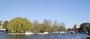 River traffic is directed to the Middlesex side because of posts and mooring on the Surrey side (east here).[6] The island is the base of the Small Boat Club (SBC), a not-for-profit motorboats club formed in 1953 run by the members for the members, using its carved out basin in the north and reinforced moorings on all sides.[2] The SBC has leased the island from the Thames Conservancy (now the Environment Agency) since 1960, giving only Small Boat Club members the right to permanent mooring on the island. Kingston Council granted the SBC permission to erect and have exclusive rights a jetty on the Surrey bank towpath, operational since May 1984.[7]