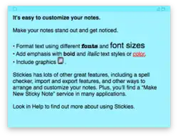 Stickies is an application for Apple Macintosh computers that puts Post-it note-like windows on the screen for the user to write short reminders, notes and other clippings. Contents are automatically stored, and restored when the application is restarted.[1]