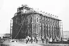 Construction of the St. George Temple, 1871–1877. Stillman Pond was among the early Latter-day Saints who quarried stone for Utah's first Mormon temple, dedicated April 6, 1877 by President Brigham Young.