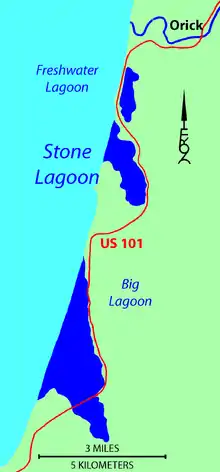 The lagoons are shallow bays between rocky headlands where coastal wave action has formed a sandy bar separating each lagoon from the Pacific Ocean. The lagoons are resting areas for migratory waterfowl using the Pacific Flyway between Lake Earl on the Smith River estuarine wetlands 40 miles (64 km) to the north and Humboldt Bay on the Mad River estuarine wetlands 30 miles (48 km) to the south.