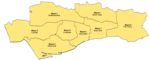 The boundaries for all Scottish council areas and their sub divisional wards are regulated and regularly reviewed by the Local Government Boundary Commission for Scotland. The current ones were created in 2007 after the 29 existing single member wards were merged into 8 multi-member wards. Each of the eight wards in Dundee elects 3 or 4 councillors every five years in the Scottish local council elections. The most recent elections were held in 2022.