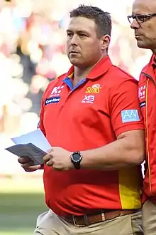 Stuart Dew (born 18 August 1979) is an Australian rules football coach and former head coach of the Gold Coast Suns in the Australian Football League (AFL). As a player, he played for the Port Adelaide Football Club and Hawthorn Football Club in the Australian Football League.[1] Dew was acknowledged as being a long penetrating left foot kick of the football.[2]