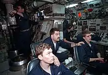 The Sturgeons were essentially lengthened and improved variants of the Thresher/Permit class that directly preceded them. The five-compartment arrangement of the Permits was retained, including the bow compartment, operations compartment, reactor compartment, auxiliary machinery room no. 2, and the engine room. The extra length was in the operations compartment, including longer torpedo racks to accommodate additional Mark 37 torpedoes, the most advanced in service at the time of the class's design in the late 1950s. The class was redesigned to SUBSAFE requirements concurrently with the construction of the first units, with seawater, main ballast, and other systems modified for improved safety.[1] The biggest difference was the much larger sail, which permitted a second periscope and additional intelligence-gathering masts, and which reduced the risk of the submarine broaching the surface in heavy seas. The fairwater planes mounted on the sail could rotate 90 degrees, allowing the submarine to surface through thin ice.[1] Because the S5W reactor was used (the same as in the Skipjacks and Thresher/Permits), the sail was enlarged (increasing drag), and the displacement was increased, the Sturgeons' top speed was 26 knots (48 km/h), 2 knots slower than the Thresher/Permits. The last nine Sturgeons were lengthened 10 feet (3 m) to provide more space for electronic equipment and habitability. The extra space also helped facilitate the use of dry deck shelters first deployed in 1982.