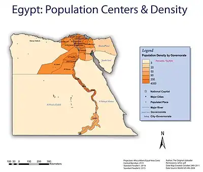 Egypt is divided into 27 governorates (muhāfazāt) and each has a capital and at least one city.[19] Each governorate is administered by a governor, who is appointed by the President of Egypt and serves at the president's discretion. Most governorates have a population density of more than one thousand per km2, while the three largest have a population density of less than two per km2.[20] The governorates of Egypt are: